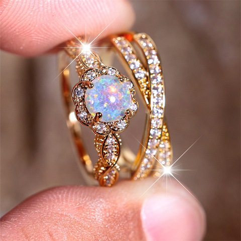 طقم خواتم من الأوبال الأبيض ، خواتم مزدوجة فاخرة من الزيركون الأبيض الكريستالي للنساء ، أطقم مجوهرات زفاف للعروس بلون ذهبي عصري
