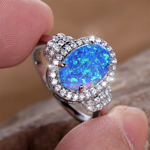 خاتم كبير من الأحجار البيضاوية والأوبال الأزرق مزين بالزركون الأبيض خاتم الخطوبة الصغير المستدير من CZ المخصص للسيدات خاتم فضي اللون الكلاسيكي مجوهرات خواتم الزفاف