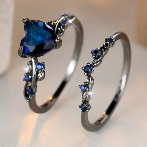 Kadınlar için Trendy aşk kalp mavi kristal nişan yüzüğü setleri Vintage siyah altın renk düğün bantları gelin takı seti