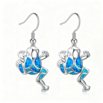 Sevimli küçük kurbağa hayvan kolye damla küpe mavi yangın Opal taş Dangle küpe kadınlar için Vintage gümüş renk düğün takısı