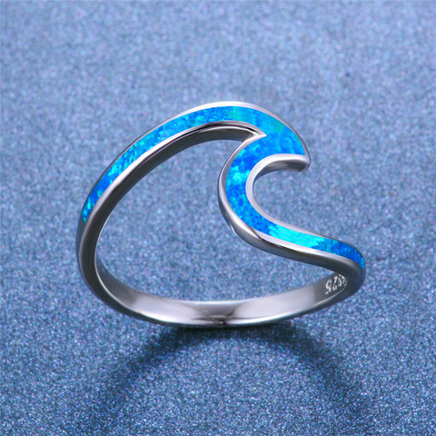 100% gerçek 925 ayar gümüş Opal dalga yüzük kadınlar için beyaz mavi ateş Birthstone takı